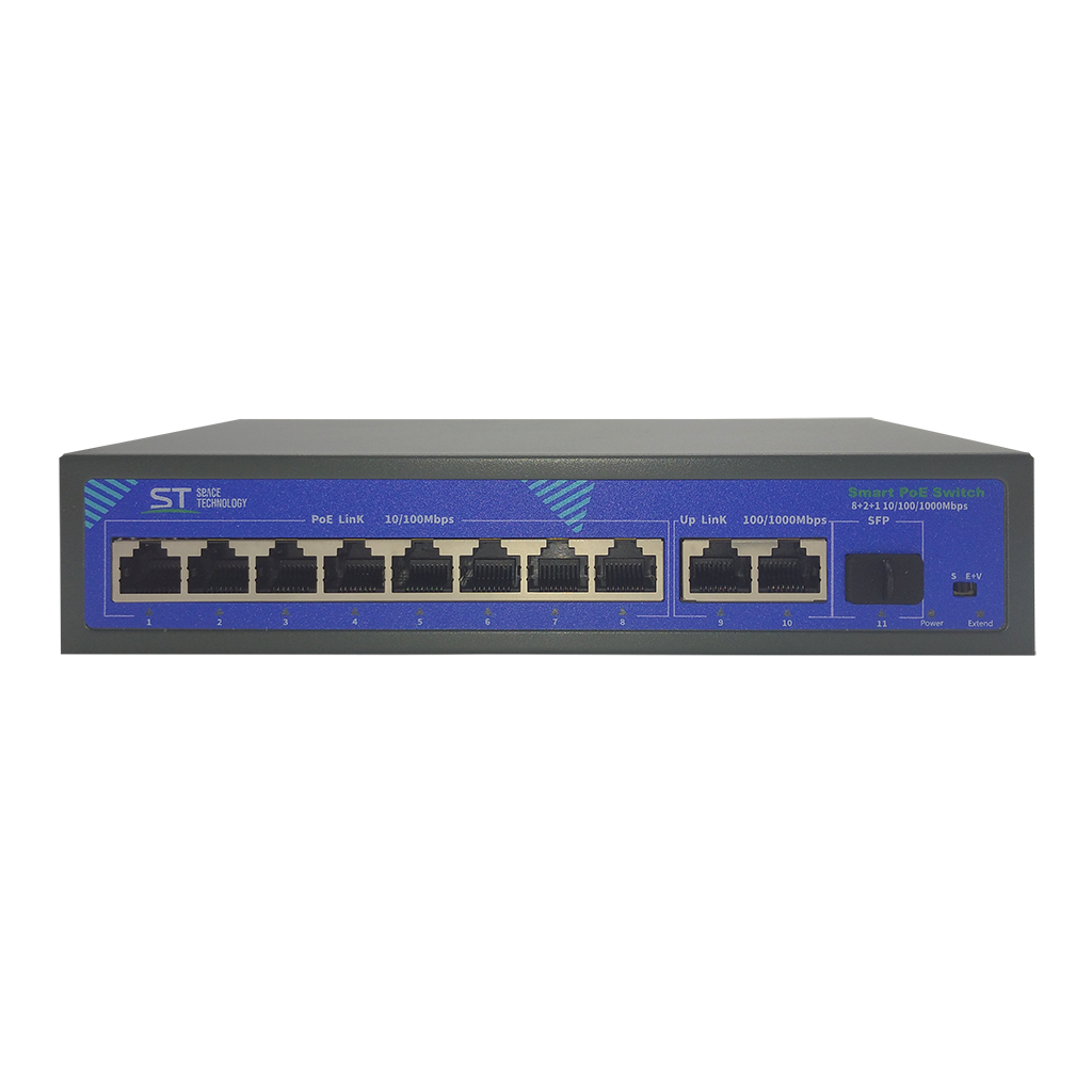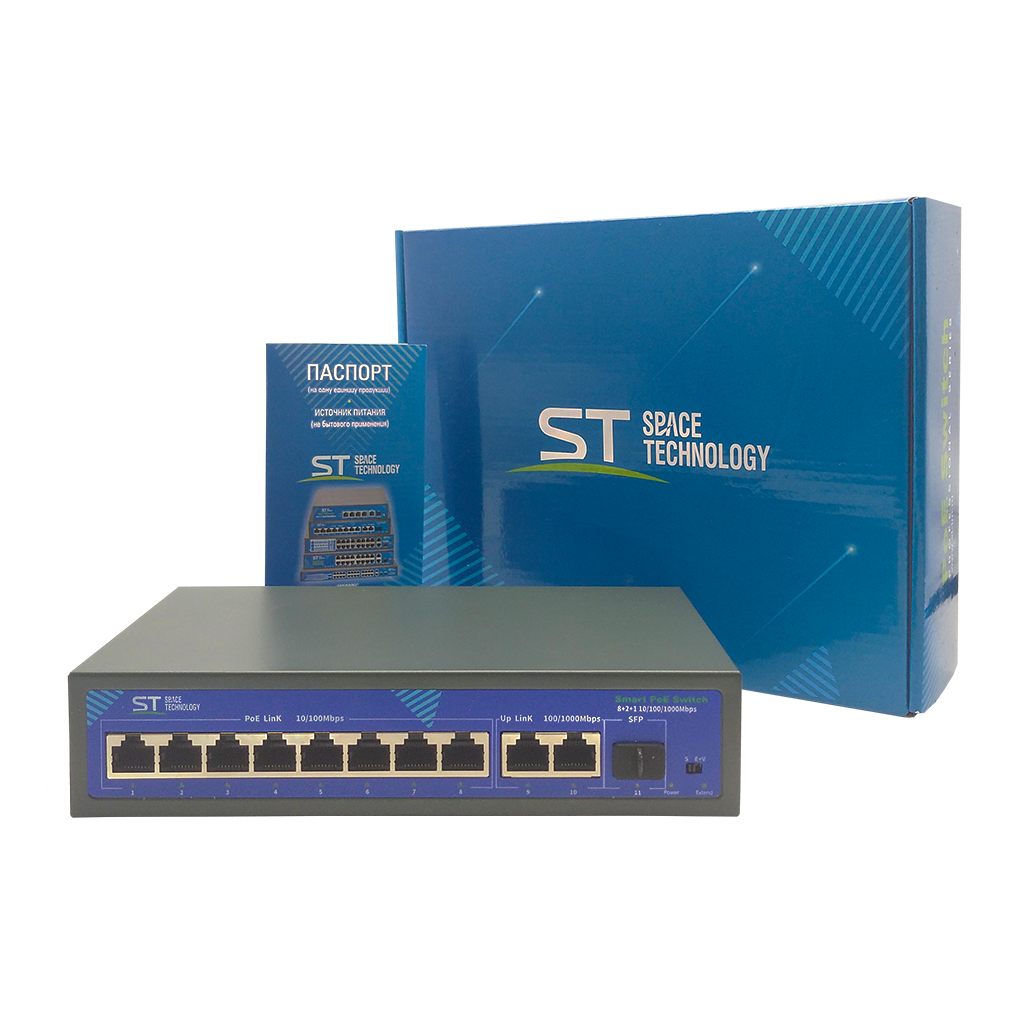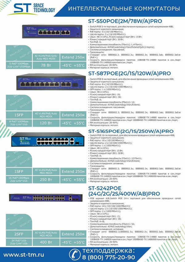 Источник питания ST-S87POE (2G/1S/120W/A)PRO, Switch POE 8-ми портовый, для обеспечения проводных сетей напряжением 48В, защита от КЗ, Extend 250м., AI PoE, AI VLAN, Грозозащита, PoE порты: 8 х (10/100 Мбит/с), UpLink порты: 2 х (10/100/1000 Мбит/с), SFP порты: 1 х (1000 Мбит/с), Max.пропускная сп-ть: 100 Мбит/канал (PoE порты)1000 Мбит/канал (UpLink и SFP порты), Uвых: 48 (±10%), Р(ном) каждый порт (Вт): 19, Р(макс) каждый порт (Вт): 30, Р(сумм) общая (Вт): 120, Тип РоЕ: А, Коммутационная способность (Гбит/с): 12, AI PoE(watchdog)/Vlan/Extend, Система охлаждения: пассивная, Металл, Температура эксплуатации: От -45°C до +55°C, Габариты изделия, мм.: 200х118х44 мм